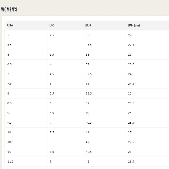 | Taille EU | Taille UK | Taille US | Longueur du pied (cm) |
