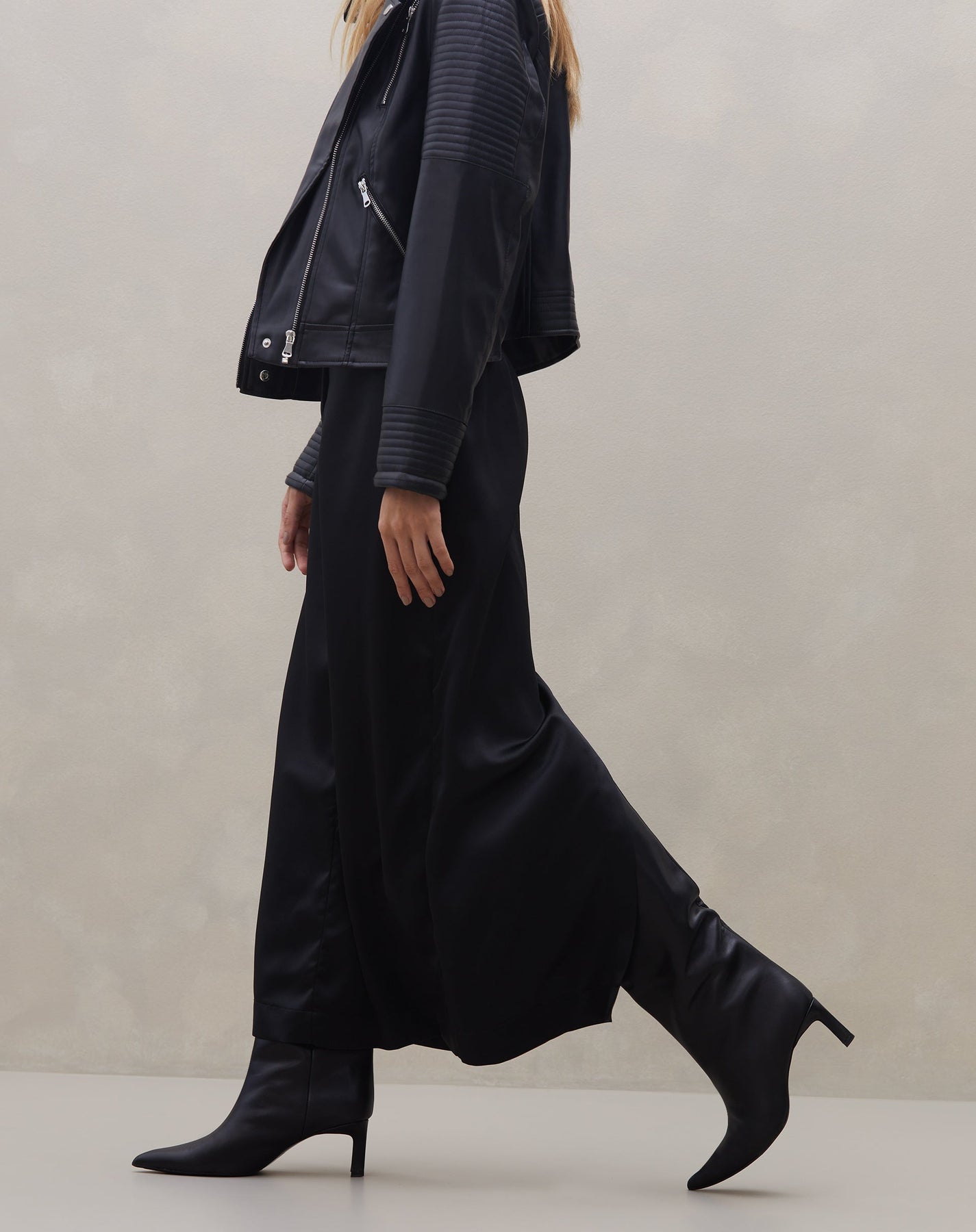 La jupe Cecilie, en satin et coupe tailleur, offre une élégance intemporelle pour des soirées et événements. Son tissu fluide et brillant sublime chaque mouvement.