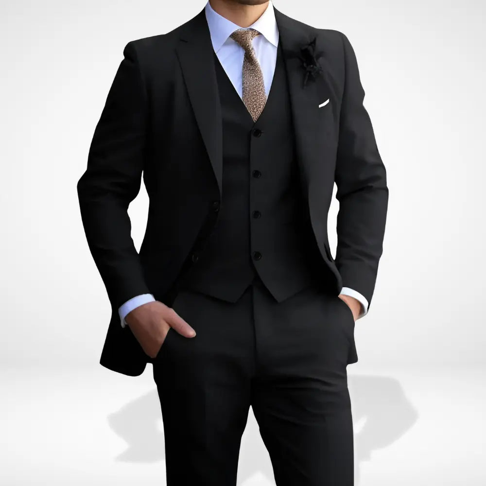 Ce costume trois pièces pour homme propose une coupe ajustée qui affine la silhouette tout en restant confortable. Idéal pour les événements formels ou professionnels, il combine veste, gilet et pantalon assortis pour un rendu structuré, sobre et soigné. Un choix pratique et élégant pour les grandes occasions.
