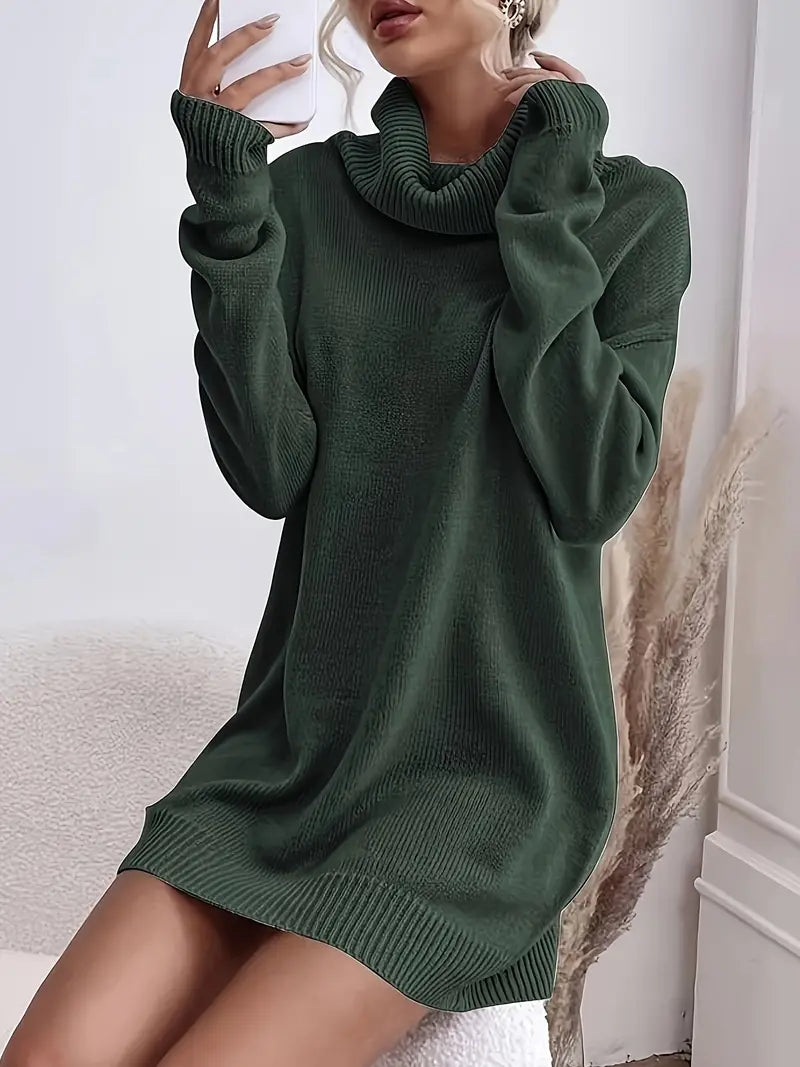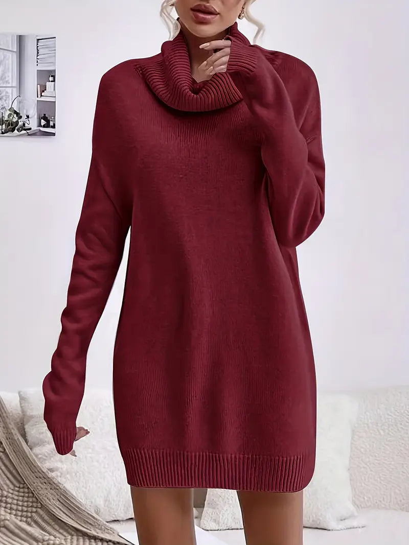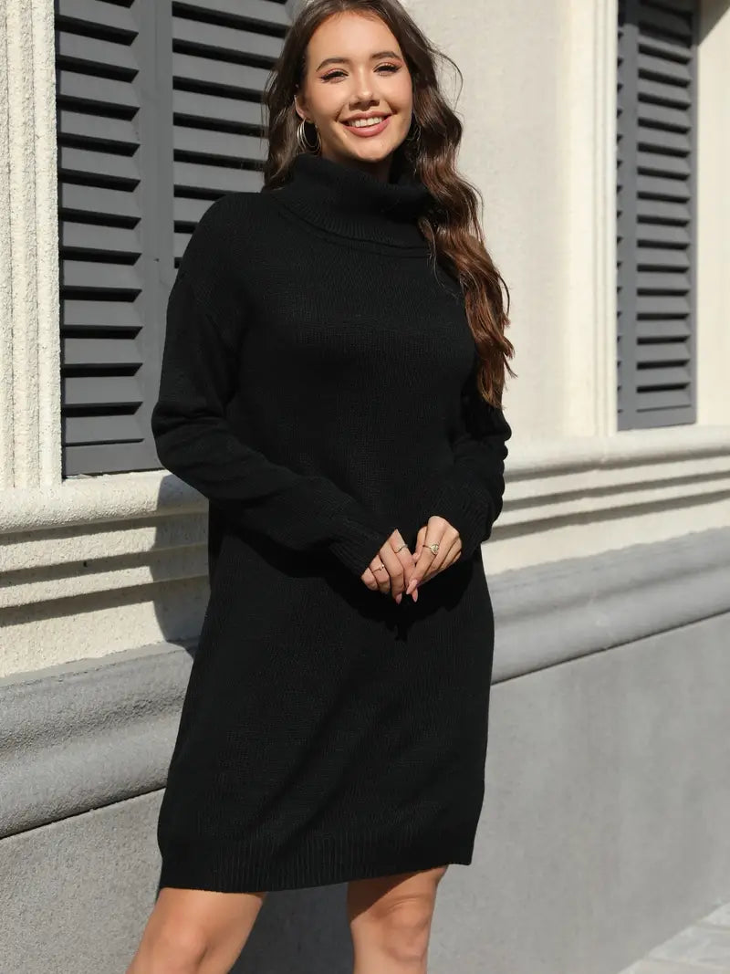 Cette robe en tricot à manches longues de couleur unie avec un col roulé élégant est parfaite pour rester au chaud et élégant en automne et en hiver. Elle est fabriquée en tricot doux et confortable et offre une robe flatteuse pour un look classique et intemporel.