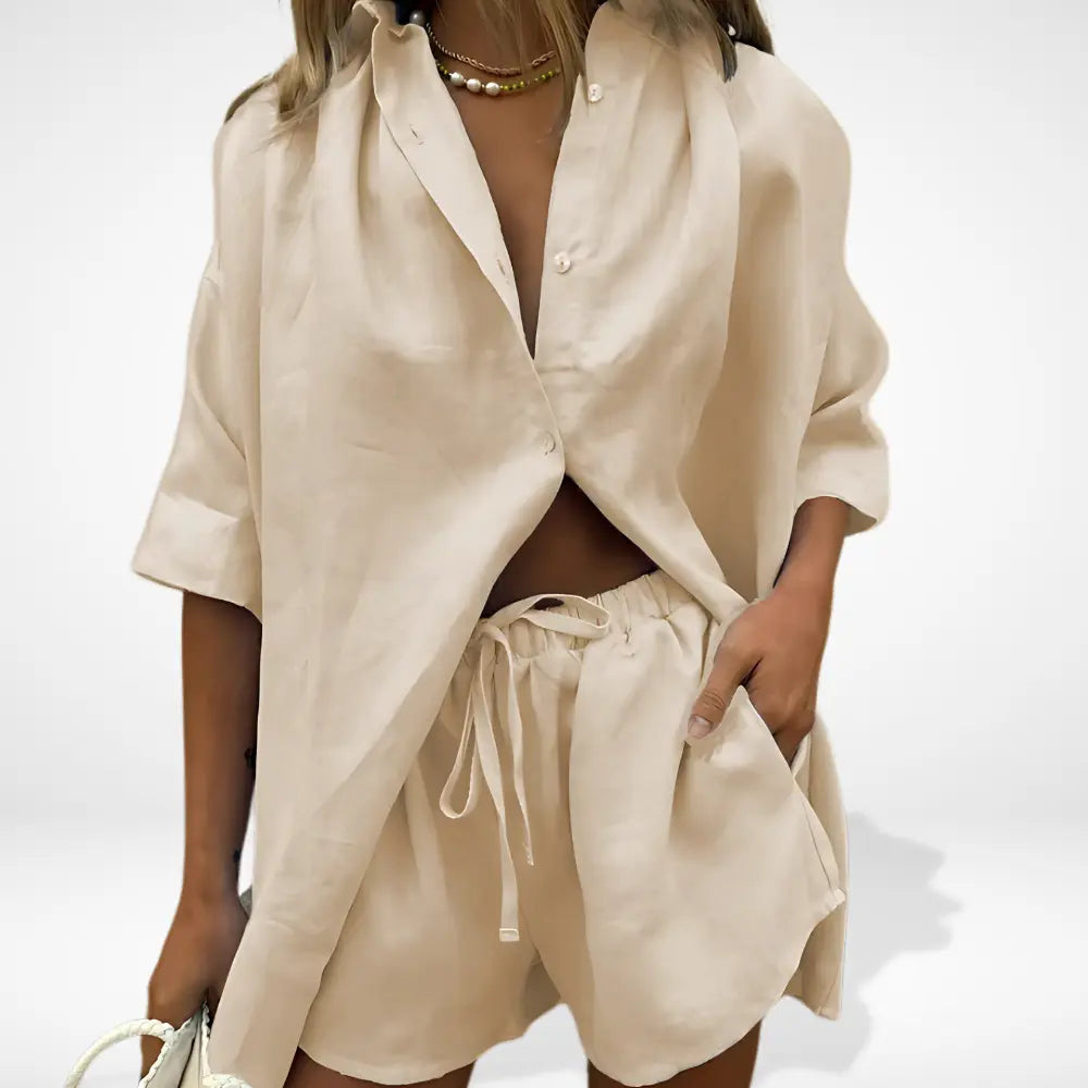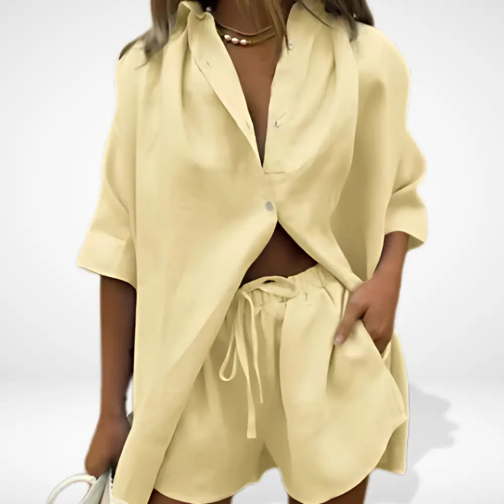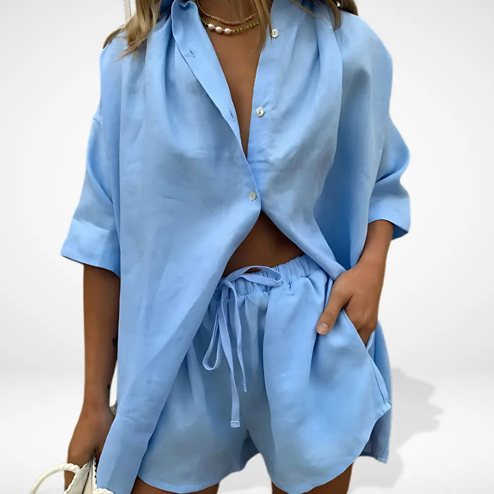 Cet ensemble coordonné pour femmes se compose d’une chemise ample et d’un short fluide à taille élastique. Léger et agréable à porter, il convient parfaitement aux journées détendues, aux vacances ou aux sorties décontractées, tout en conservant une allure élégante et soignée.