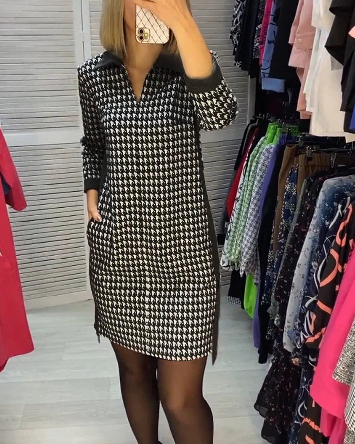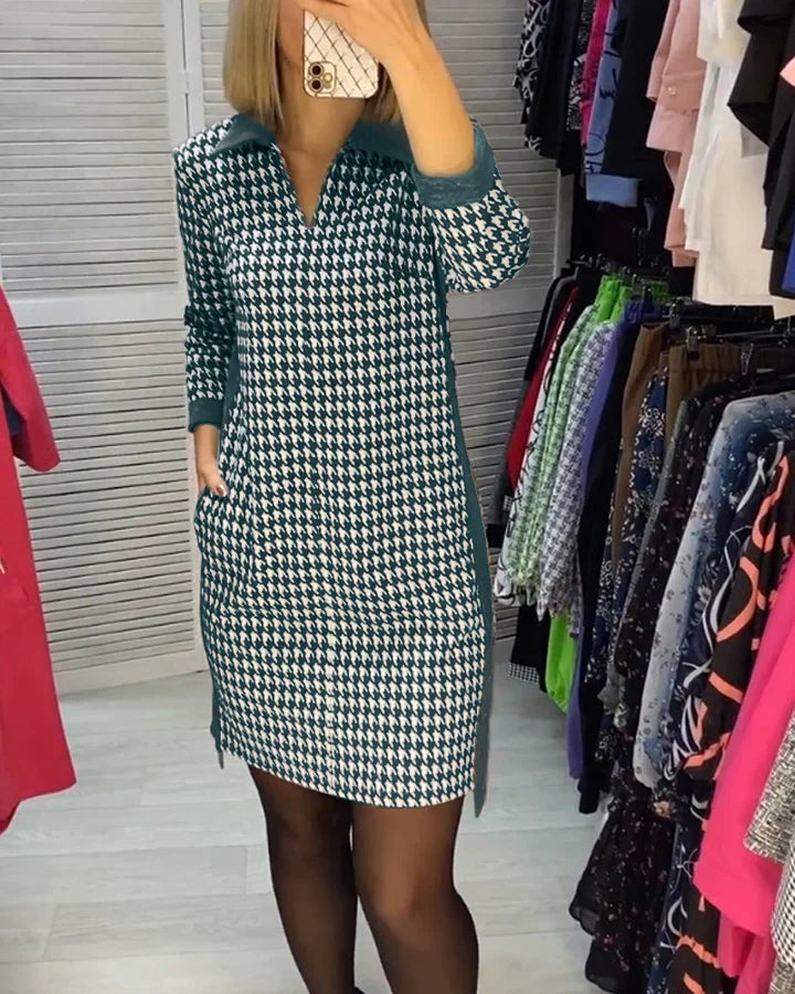 Robe Décontractée à Col V Imprimé Pied de Poule