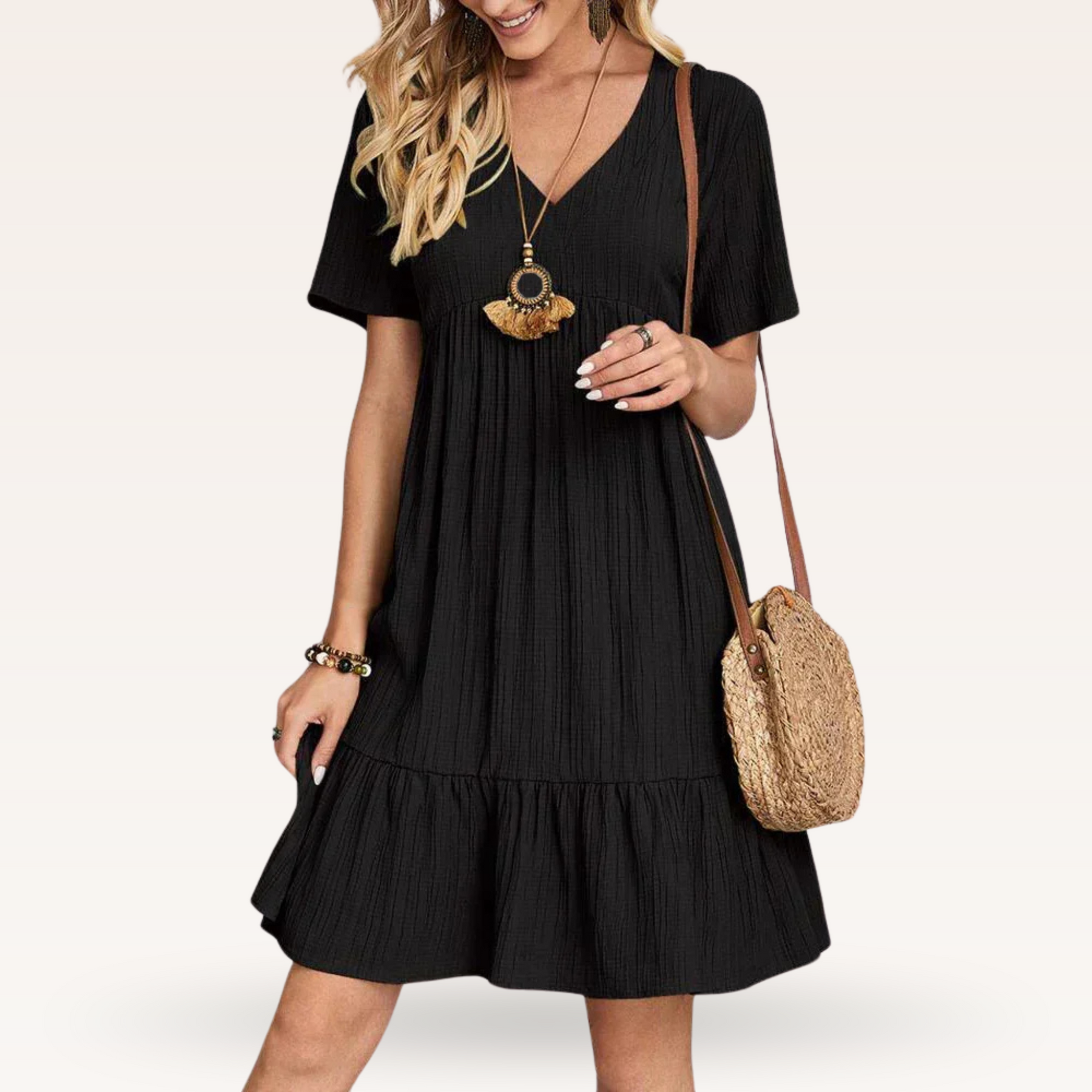 Découvrez la robe d'été parfaite ! Ce modèle court et fluide, orné de volants ludiques, met en valeur vos jambes tout en offrant un style bohème sans effort.