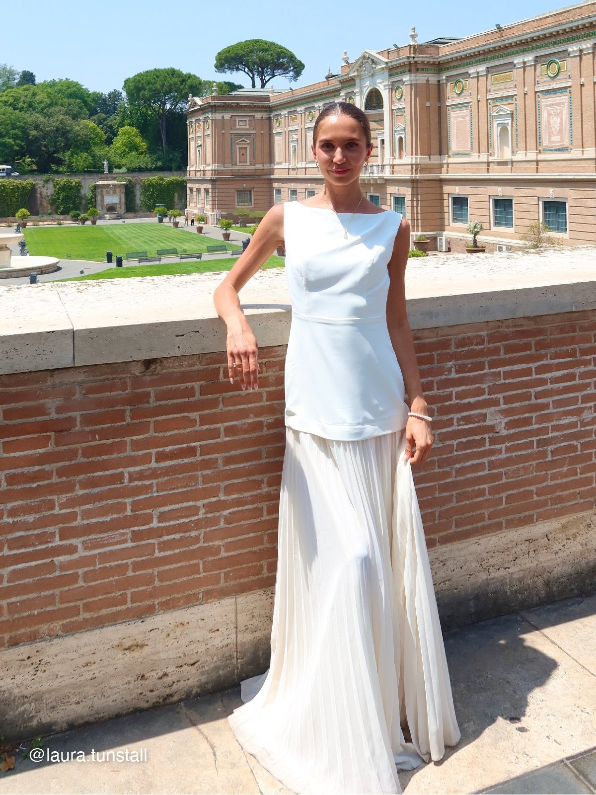 Cette robe longue trapèze incarne une élégance discrète avec sa teinte blanc cassé et sa coupe fluide. Sans manches et dotée d’un col bateau délicat, elle met en valeur les épaules avec subtilité. Le tissu plissé ajoute du mouvement et une touche sophistiquée à cette pièce idéale pour les journées d’été, les cérémonies ou les soirées raffinées.