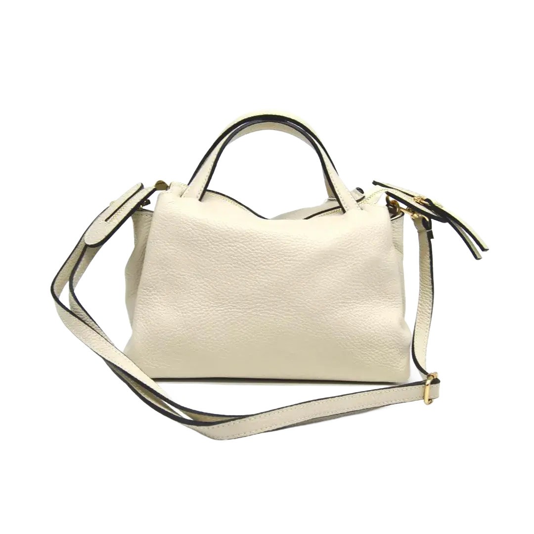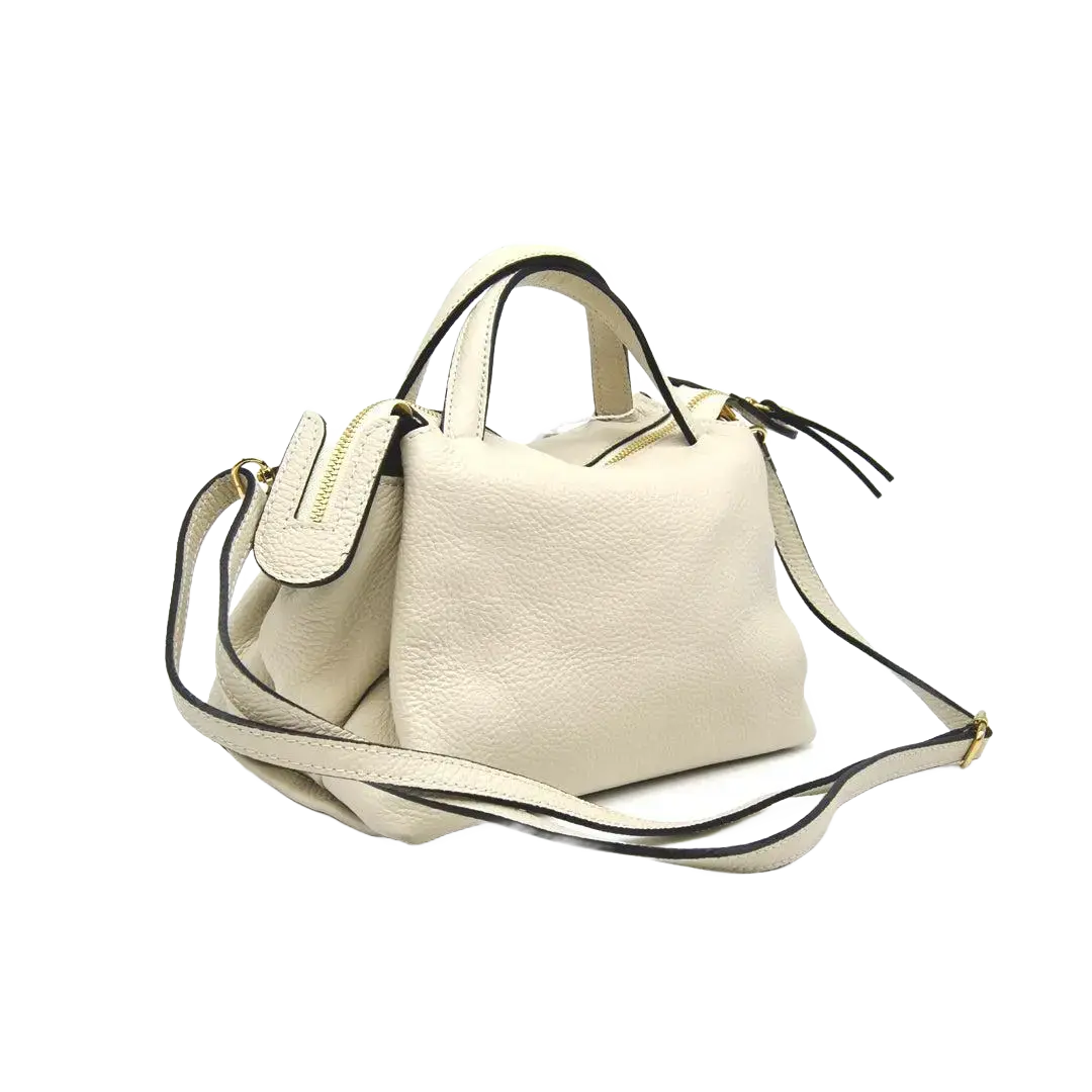 Sac en cuir, deux poignées et une bandoulière réglable.