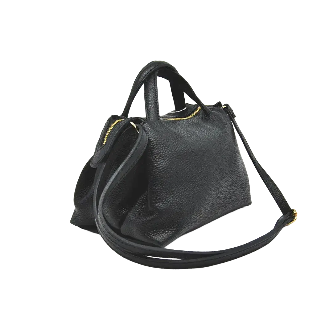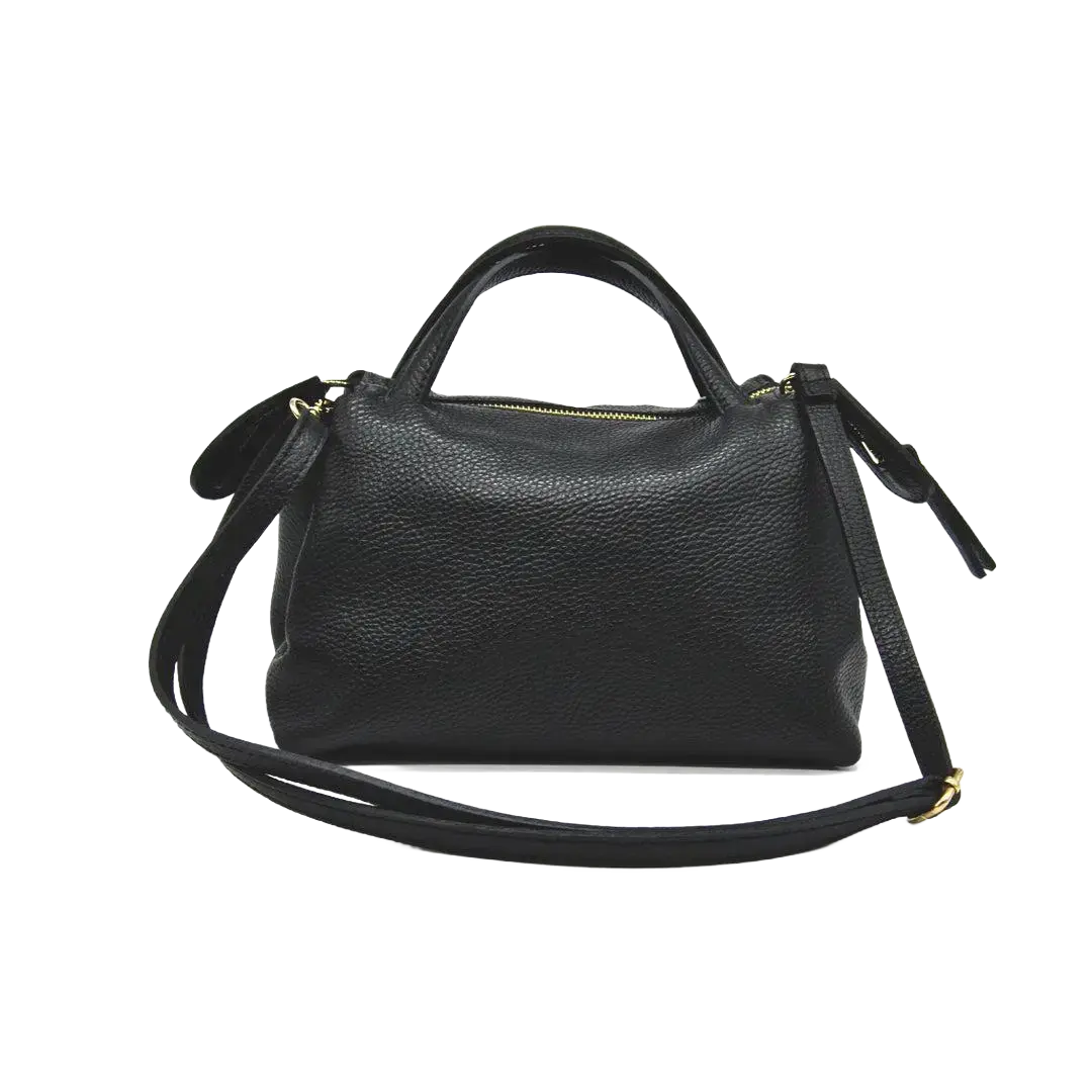 Sac en cuir, deux poignées et une bandoulière réglable.