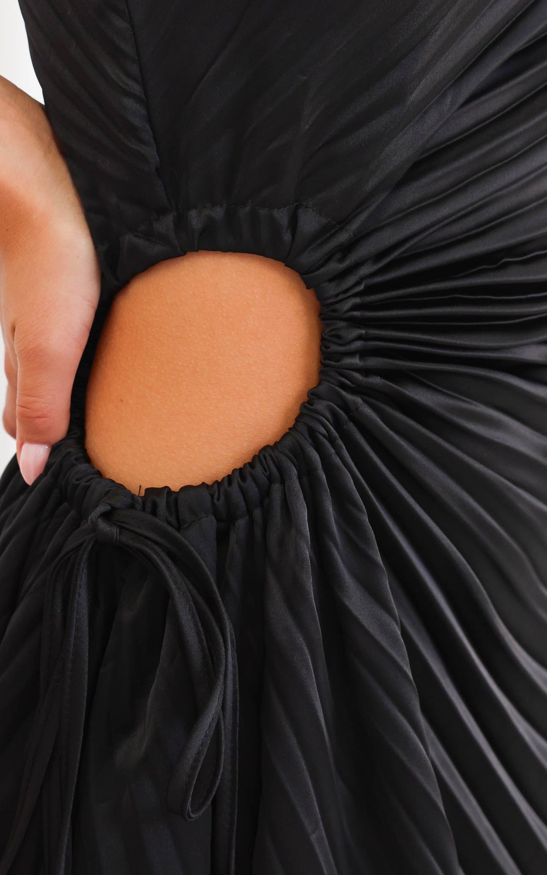 – One shoulder on left side, all over pleated design