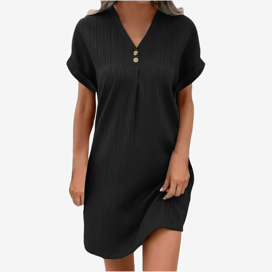 Découvrez Romélie™, la robe idéale pour le quotidien, à l'élégance décontractée. Confectionnée dans un tissu côtelé respirant rappelant le lin, cette robe à col en V, ornée de deux boutons décoratifs et de manches courtes souples, offre confort et style en toute simplicité. Tombant juste au-dessus du genou avec un ourlet légèrement arrondi, elle est parfaite pour les matinées tranquilles, les sorties décontractées ou les courses estivales. Ses poches, pratiques et pratiques, font de Romélie™ la pièce incontournable pour une allure chic et décontractée.