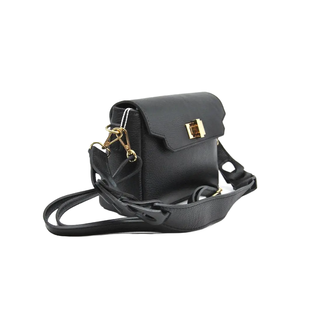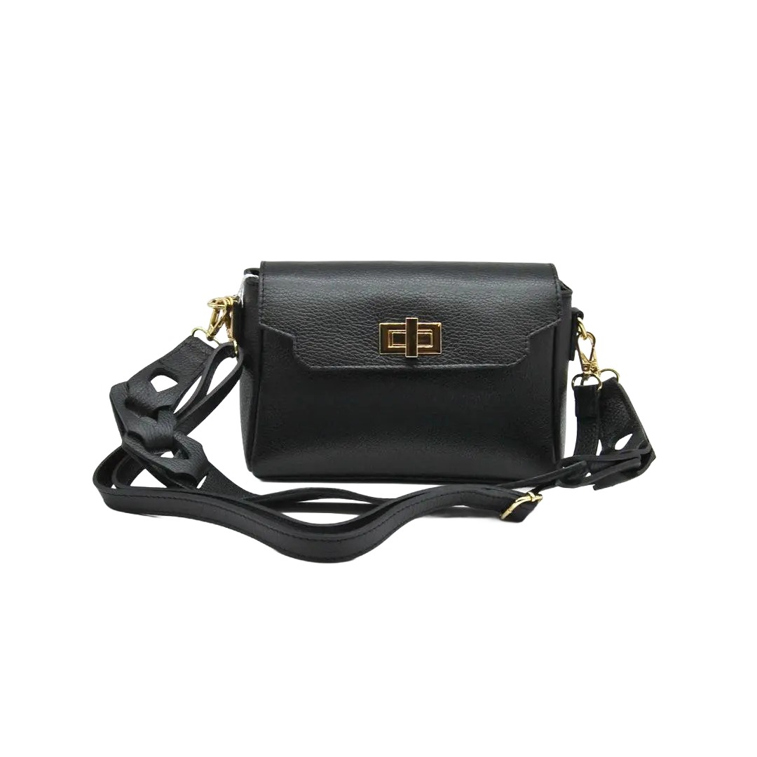 Sac en cuir, double fermeture avec fermeture éclair cachée et rabat avec accessoire, pieds sur le fond.