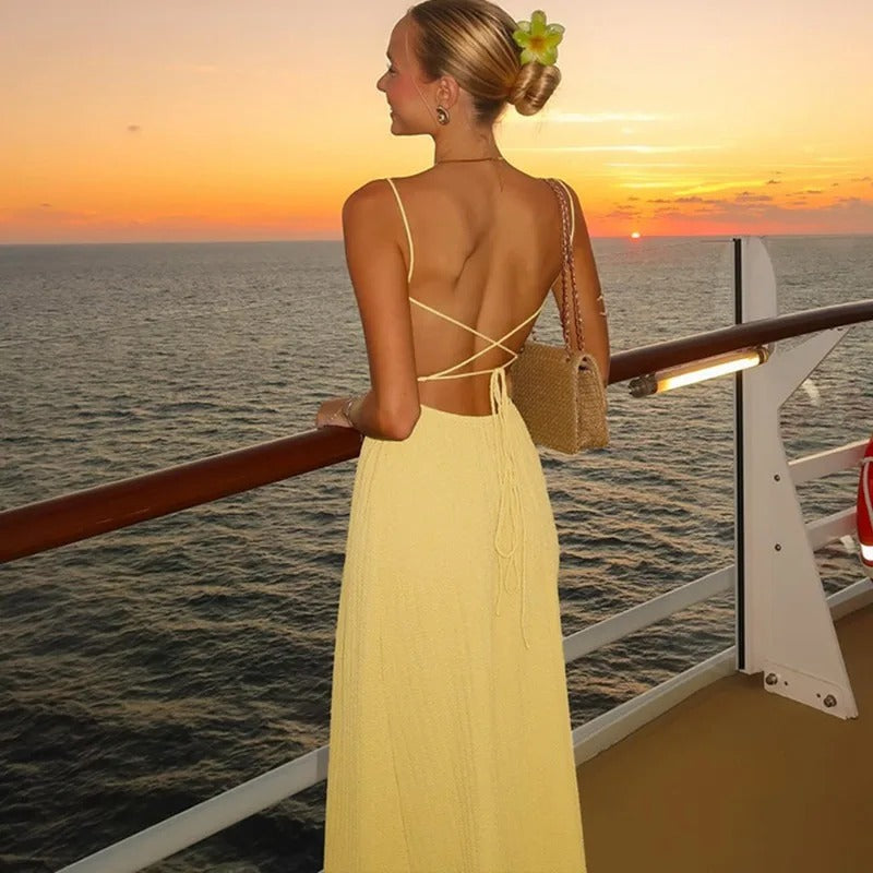 Cette robe longue et fluide, idéale pour les journées ensoleillées, est dotée d’un décolleté moderne et d’une coupe fendue qui laisse apparaître les jambes. Son design noué à la taille crée une silhouette élégante et féminine.