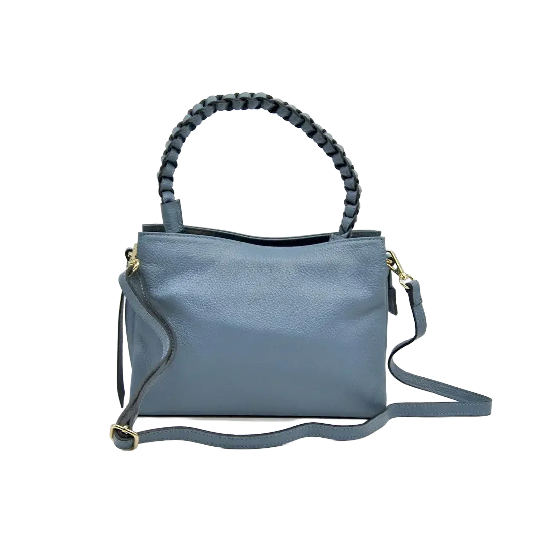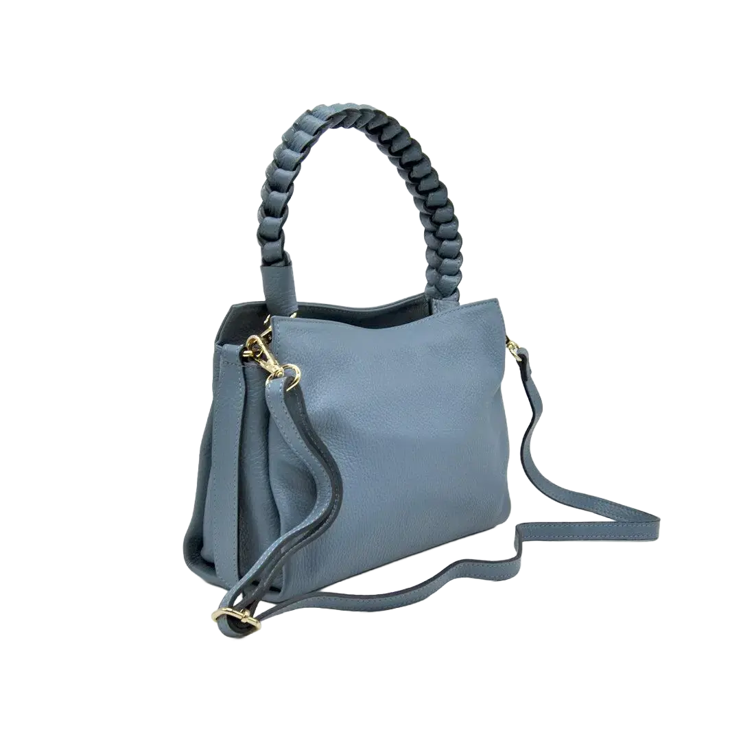 Sac en cuir, fermeture avec fermeture éclair, large poignée tressée et bandoulière réglable.