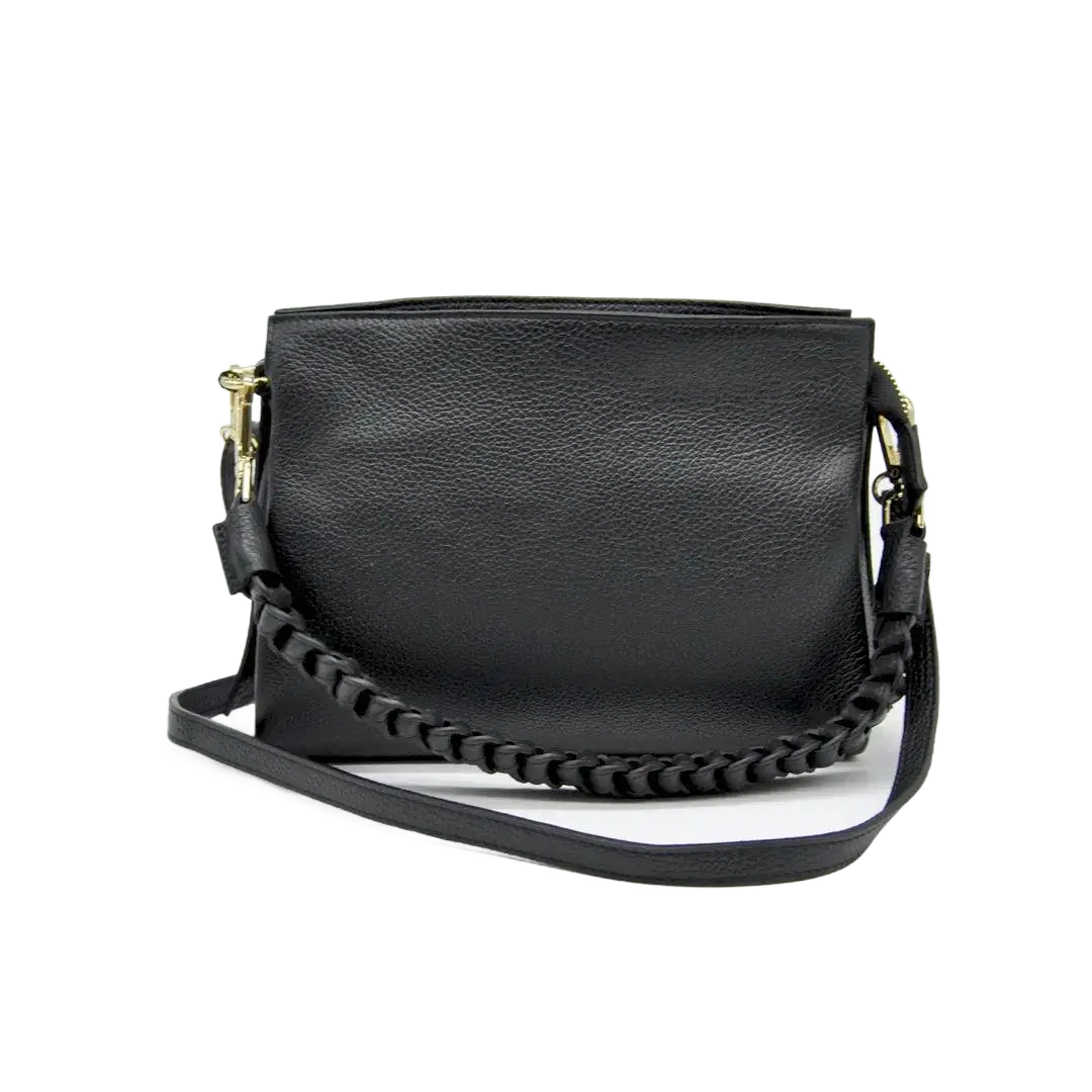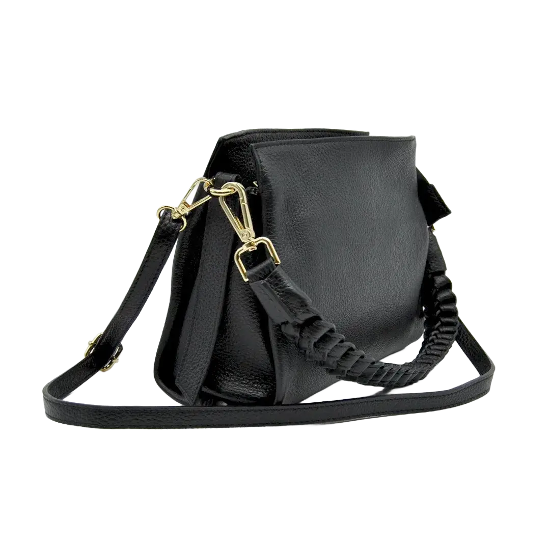 Sac en cuir, fermeture avec fermeture éclair, large poignée tressée et bandoulière réglable.