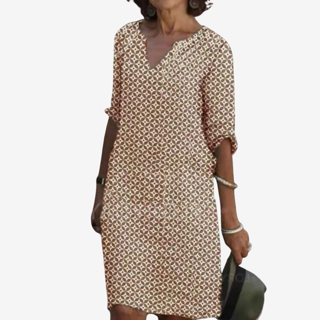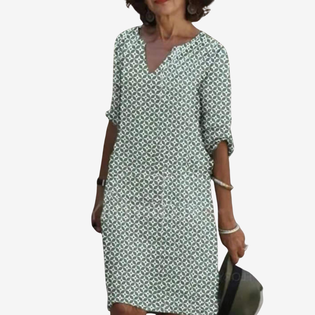 La Sylvaine™ est une robe mi-longue et fluide, ornée d'un imprimé géométrique moderne, parfaite au quotidien avec une touche raffinée. Confectionnée dans un tissu léger et doux, elle épouse délicatement la silhouette tout en offrant un confort optimal. Ses manches trois-quarts ajustables lui confèrent une touche d'élégance et de polyvalence. Que vous profitiez d'un brunch décontracté, d'une promenade en ville ou d'un événement estival, Sylvaine™ s'adapte sans effort.