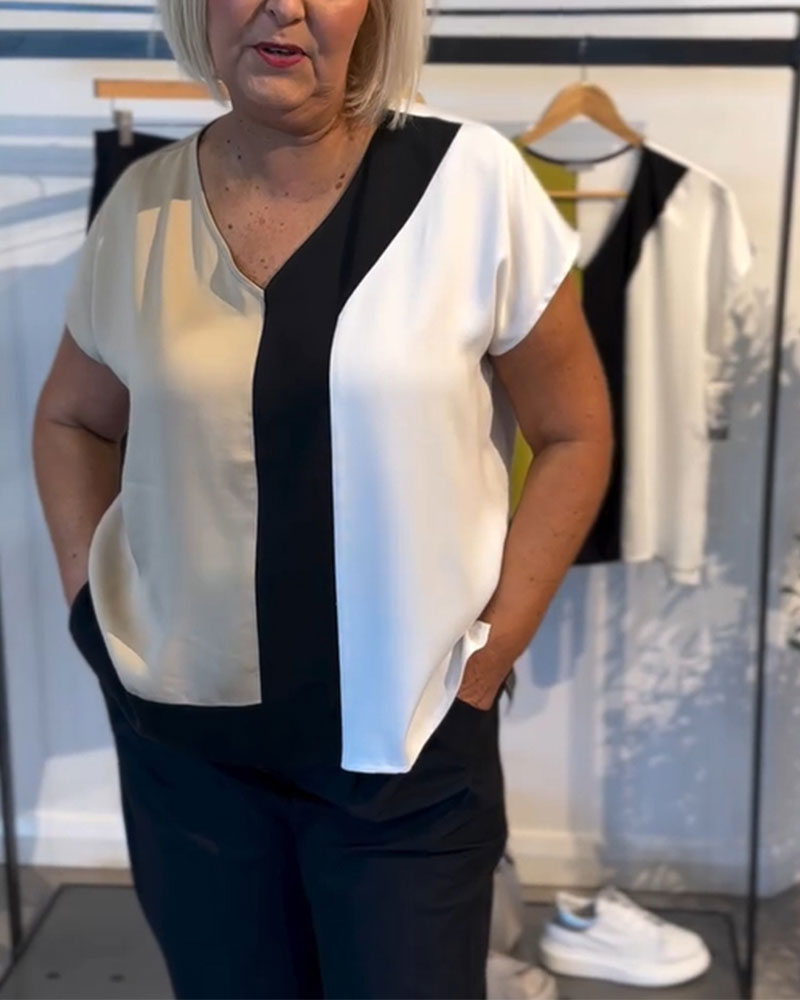 T-Shirt Col V Couleur Contrastée Mode