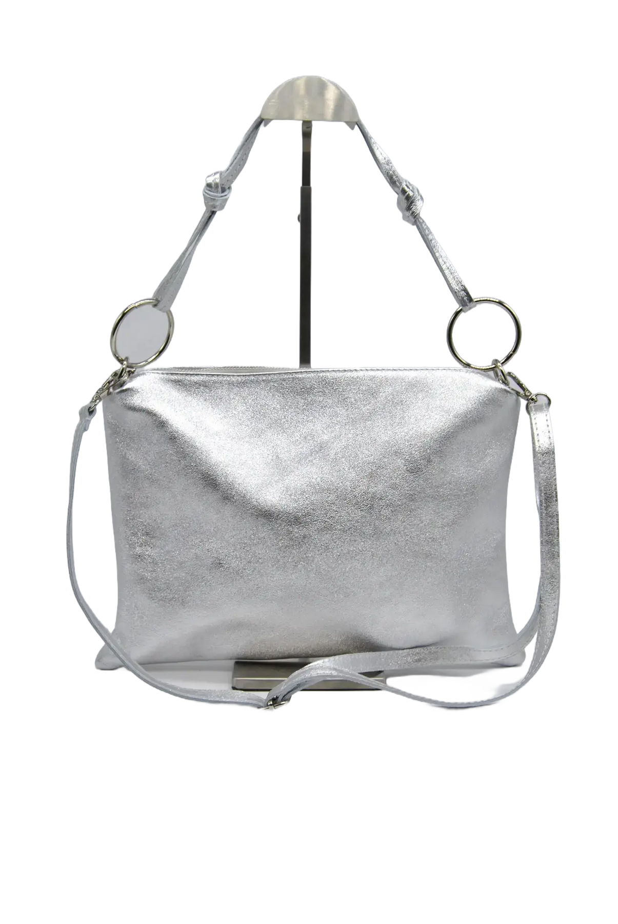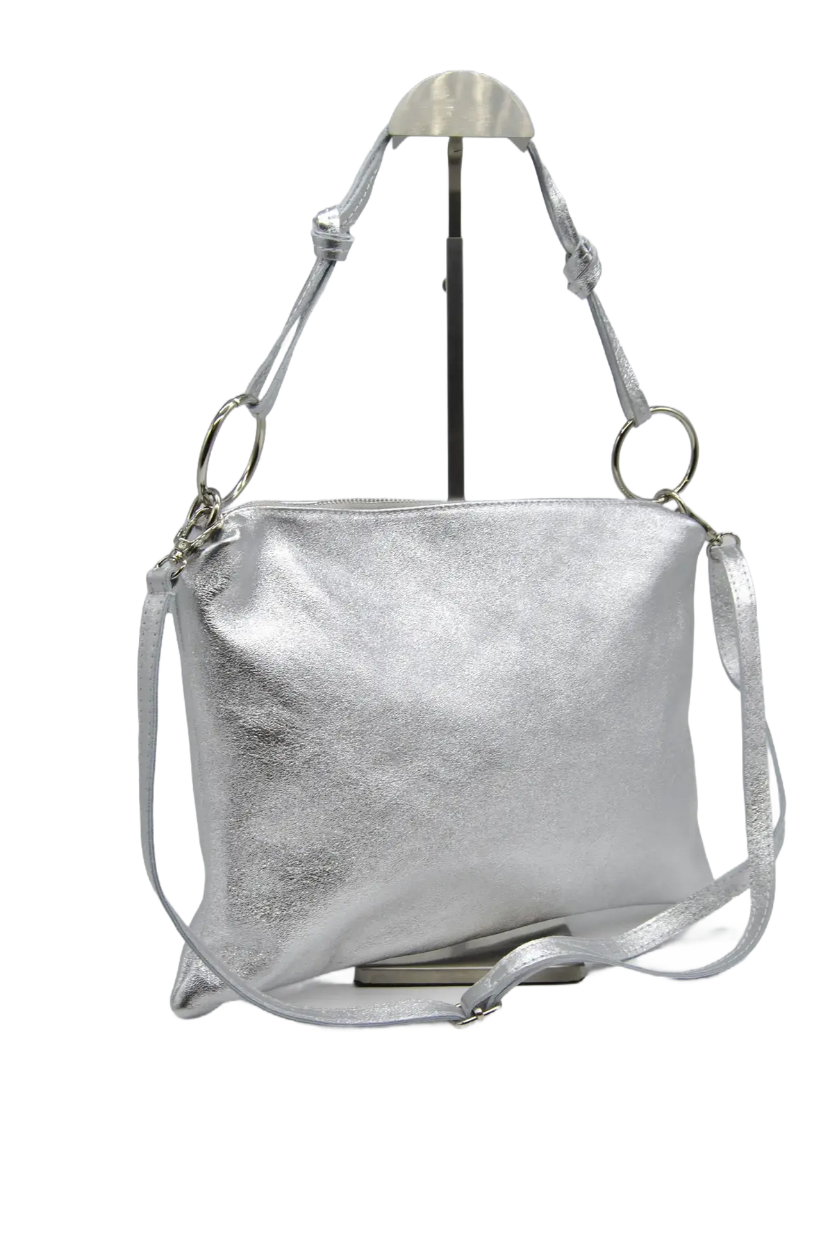 Sac en cuir avec anneaux, poignée avec nœuds et bandoulière réglable.